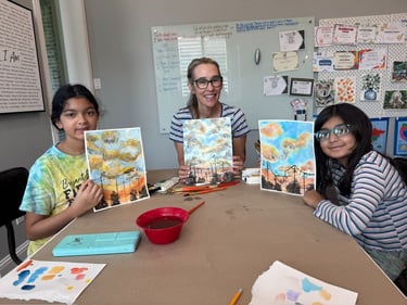 I offer fun and engaging kids’ watercolor art classes for young artists ages 4-12, where they can explore watercolor techniques with a sprinkle of acrylic painting, oil pastels and basic drawing mixed into our creative projects! For older kids (8-12) who have watercolor experience and are ready to step up their skills, I offer special skill-building classes by request.